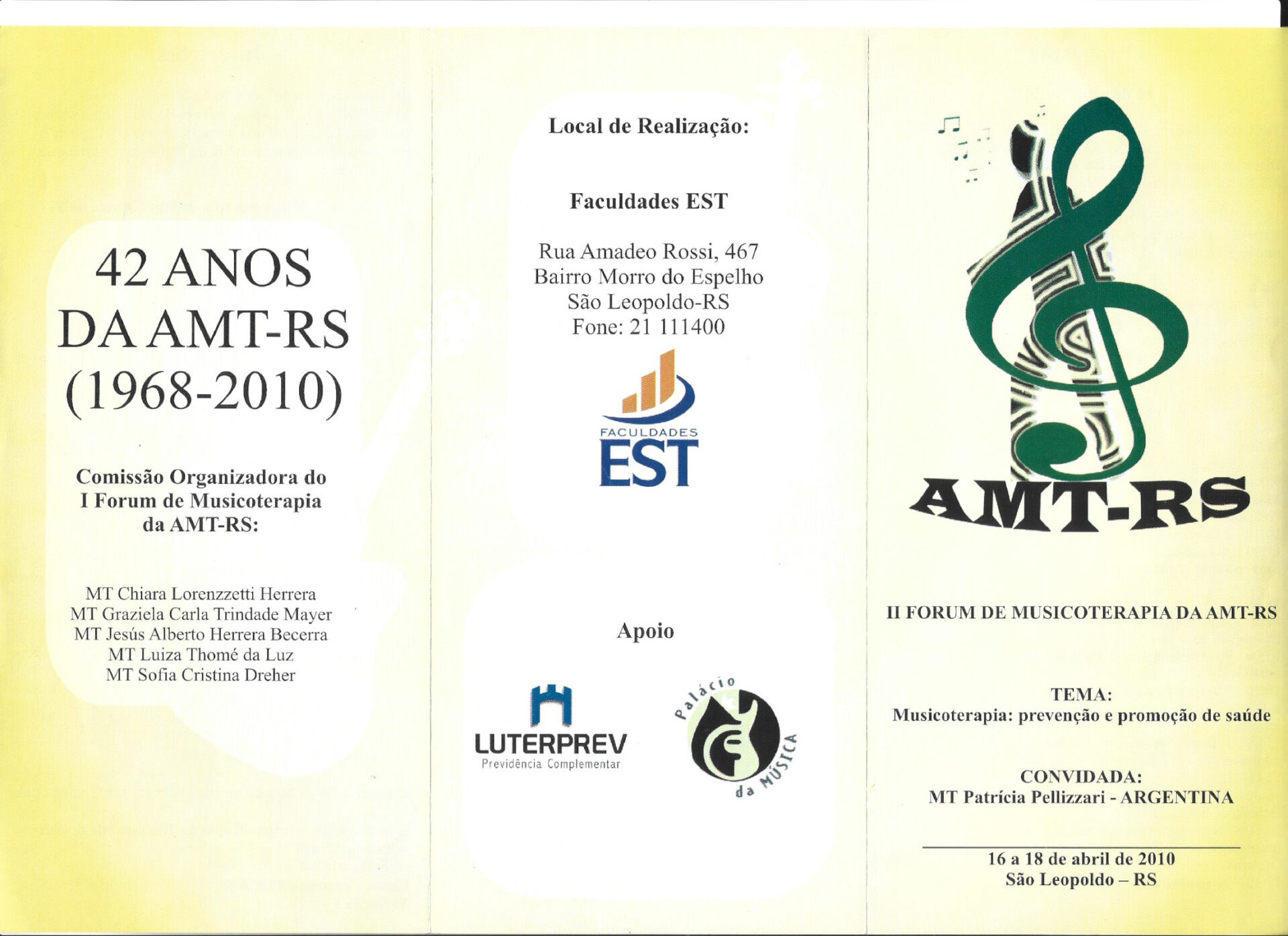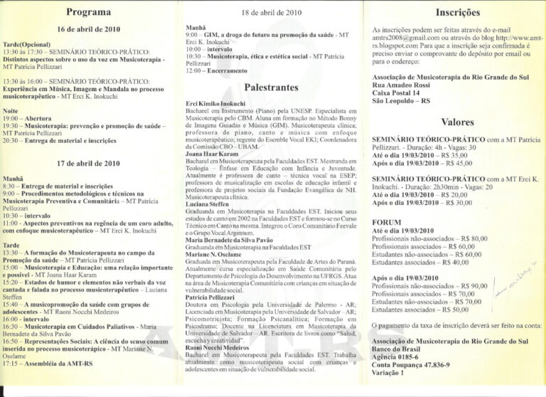 II Fórum de Musicoterapia da AMT-RS Retornar à listagem de Histórico de Eventos Ano 2010 II Fórum de Musicoterapia da AMT-RS Organizadora: AMT-RS Tema: Musicoterapia: prevenção e promoção de saúdeLocal: São Leopoldo/RS Anais do Evento Galeria de fotos