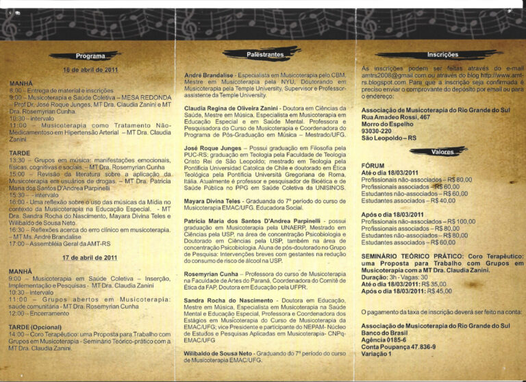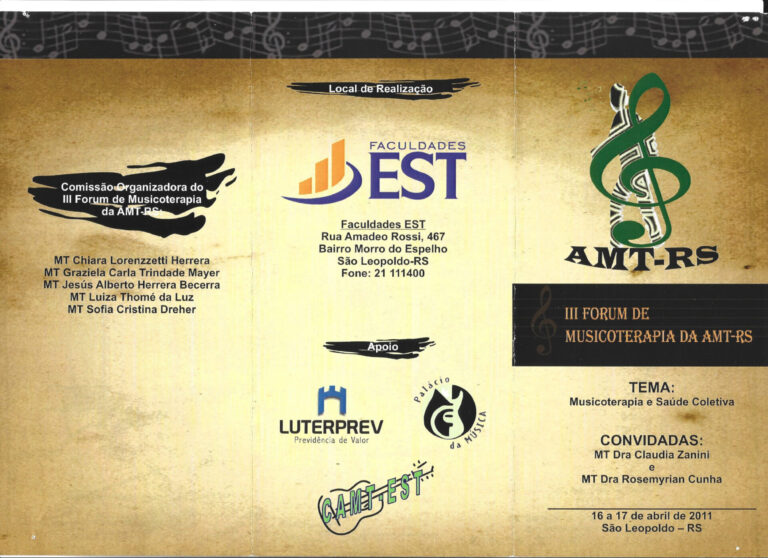 III Fórum de Musicoterapia da AMT-RS Retornar à listagem de Histórico de Eventos Ano 2011 III Fórum de Musicoterapia da AMT-RS Organizadora: AMT-RS Tema: Musicoterapia e Saúde ColetivaLocal: São Leopoldo/RS Anais do Evento Galeria de fotos