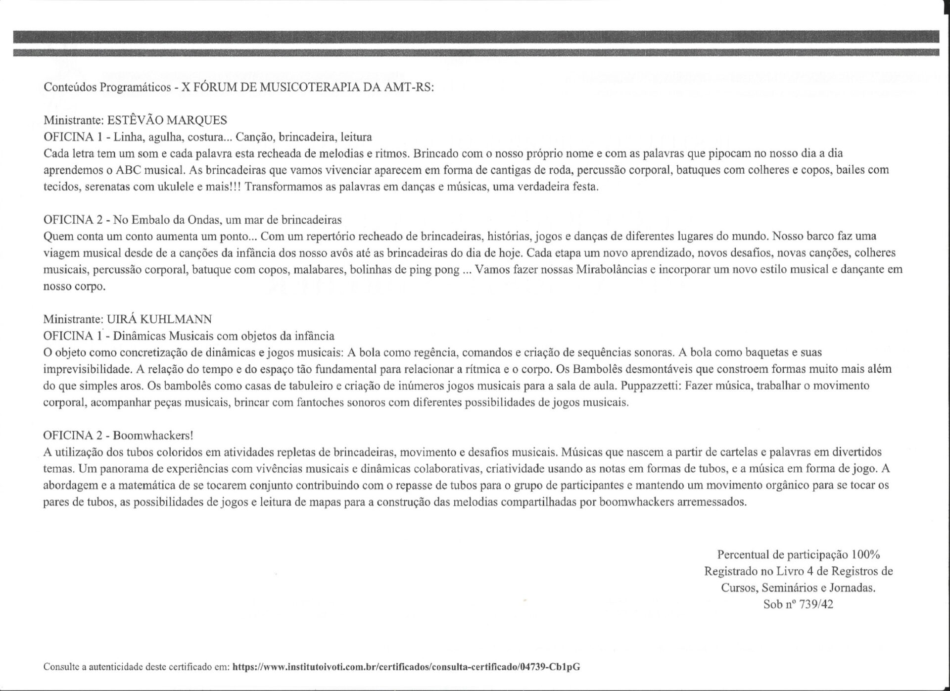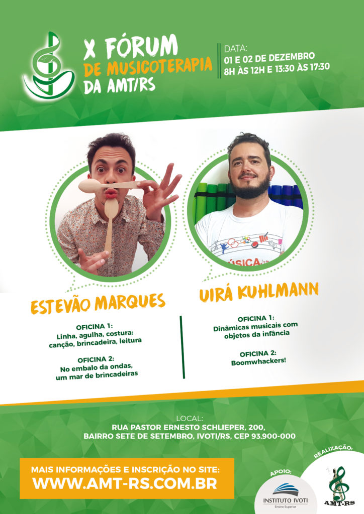 IX Fórum e II Seminário de Musicoterapia da AMT-RS Retornar à listagem de Histórico de Eventos Ano 2018 IX Fórum e II Seminário de Musicoterapia da AMT-RS Organizadora: AMT-RSTema: Linha, agulha, costura…canção, brincadeira, leitura e No embalo das ondas, um mar de brincadeiras. Dinâmicas musicais com objetos da infância e Boomwhackers.Local: Ivoti/RS Galeria de fotos Programação Folder Foto