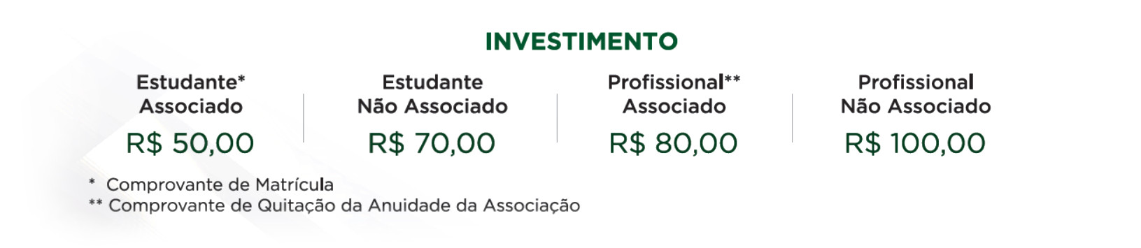 | Categoria | Estudante não Associado, Profissional Associado, Profissional Não Associado, Estudante Associado AMT |